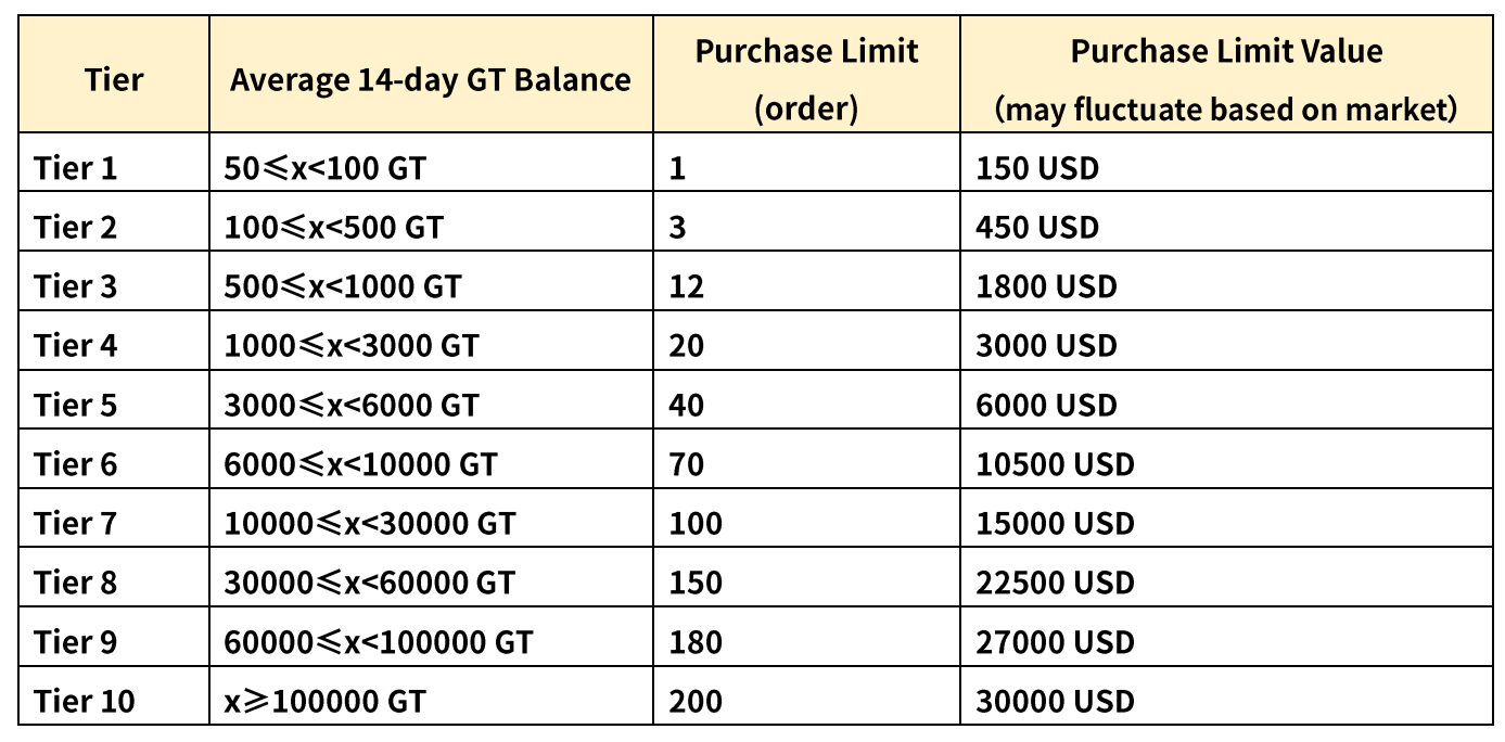 (4) Purchase limit: The individual purchase limit will be calculated based on the average holdings of GT (including the asset in Lending/Borrowing Market, and the GT bought with USDT borrowed from Margin Trading; however, GT borrowed from Margin Trading is not included) 14 days prior to the sale. Users with no GT holdings cannot participate in the sale. Participants can have a higher purchase limit with more GT holdings. Below is chart that shows the purchase limit based on different amount of GT holdings.