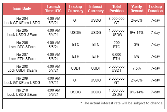 We are going to launch the No.204 round on May 3rd, 2021 at exactly 4:00 AM UTC. This round, we are planning to lock 3,000,000 GT in total for a period of 7 days, with an estimated reward of 2%-6% P.A.