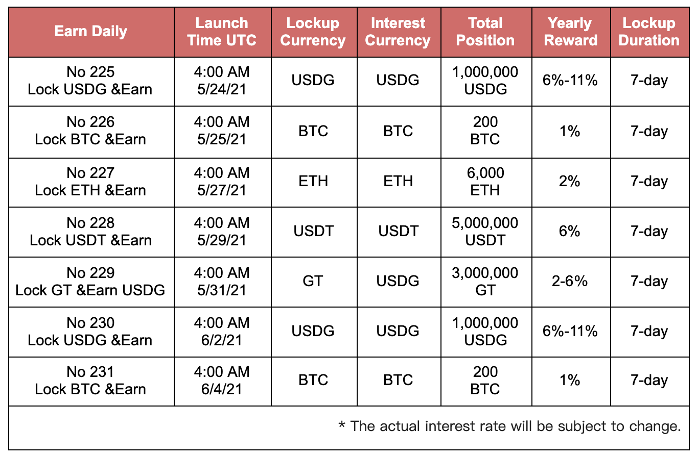 stablecoins (such as BTC, ETH, USDT, GT and USDG) for a period of 7