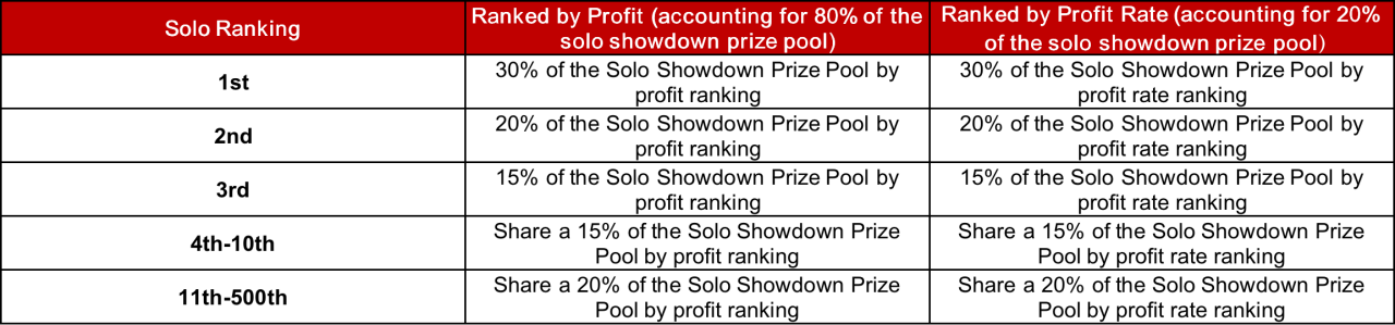 During the competition, the prize pool will be expanded based on the number of participants. The more users participating in the competition, the higher the total prize pool will be. We will rank the sequence results according to the amount of profit and profit rate. In both troop showdown and solo showdown prize pools, a share of 80% of the corresponding prize pool rewards will be offered according to rank of the profit, and the remaining share of 20% of the corresponding prize pool will be offered according to the proportion of profit rate ranking. The final prize pool will be determined by the valid trading users.