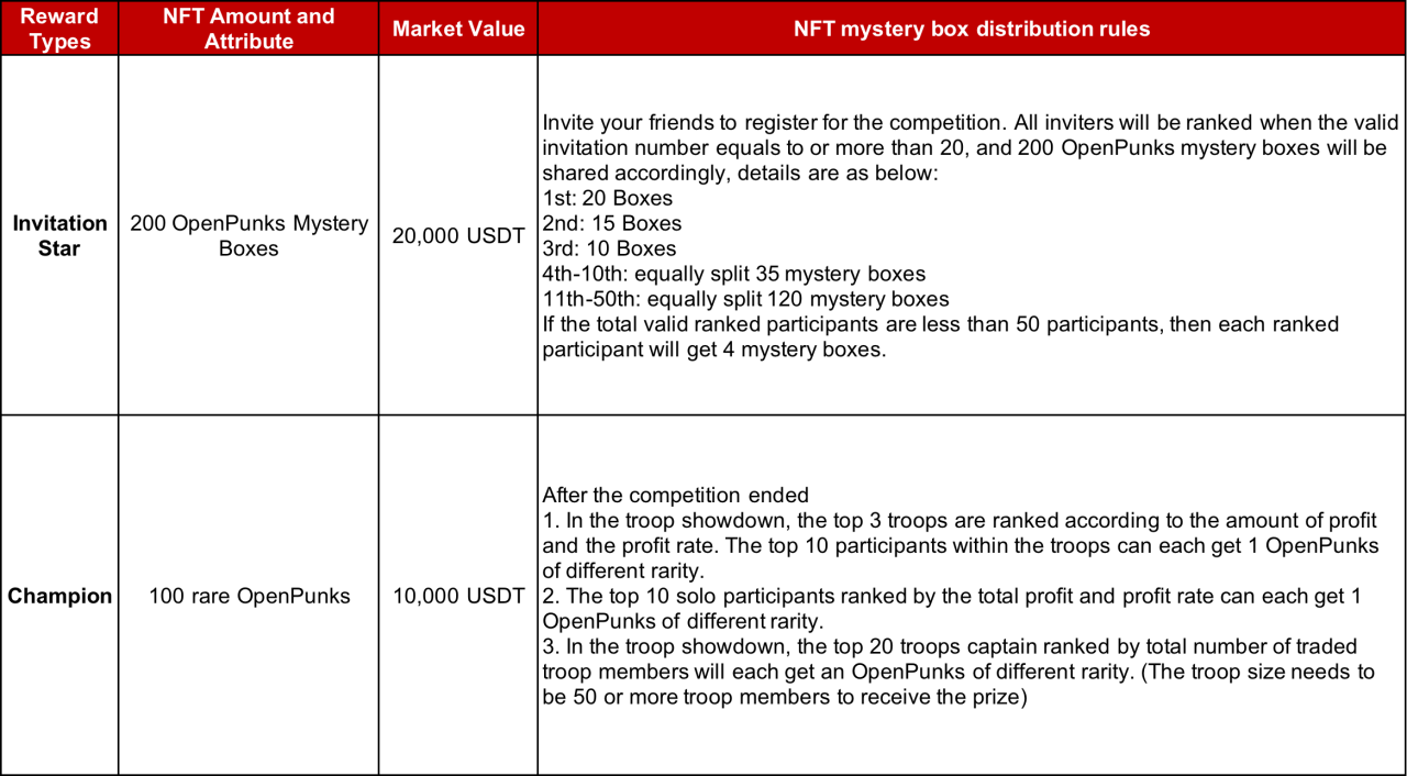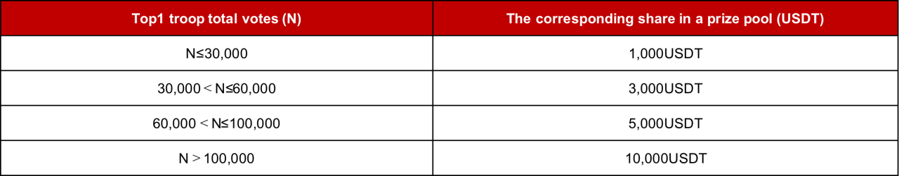 Reward 2: During the competition, the troop captain can invite friends via the event invitation link to join the troop. The troop captain and the invitees will receive a $10 contract bonus each after captain invites a new users to join the toop. (the bonus will only be issued after 5 members joined the troop). The second prize pool is $10,000. First-come, first-served.