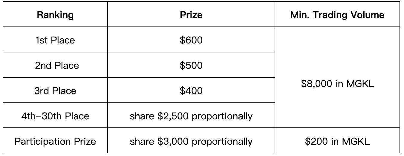 取引高に基づく資格のあるユーザー全員が$7,000相当のMGKLの山分けを得れます。