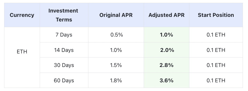 Please note that if you have subscribed to a product before the APR adjustment, the interest at maturity will be calculated at the APR when your order is successfully made. After it is restaked automatically, the interest at maturity will be calculated at the latest APR on the product page.