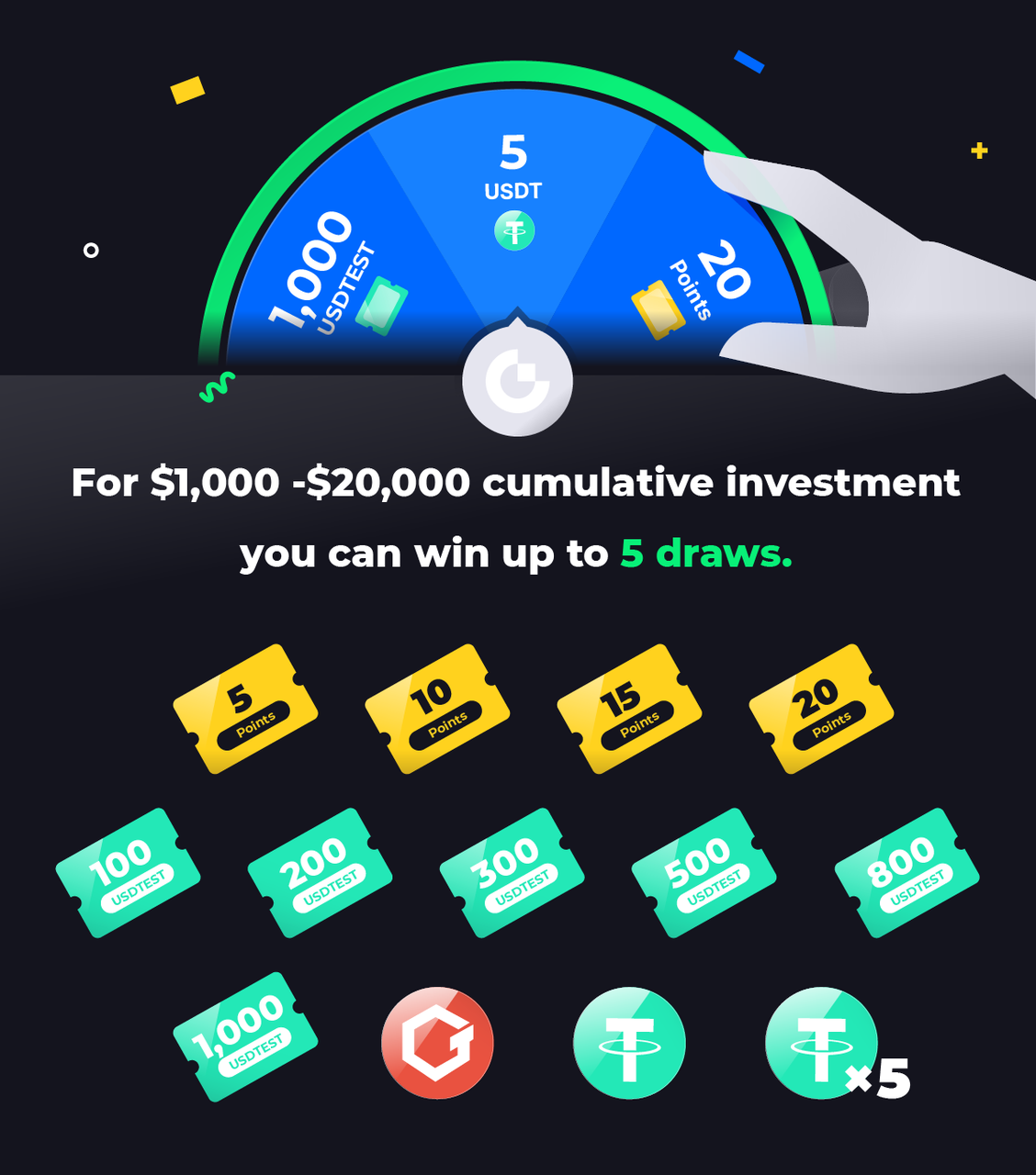 このイベント期間中にデュアル投資に 100 USDT 以上を投資した新規ユーザーは、バウチャー、USDTEST、トークン、その他多くのギフトから幸運な賞品を抽選するチャンスを 1 回得ることができます。
