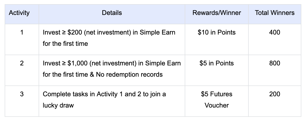 خلال هذا الحدث، يمكن لجميع المشاركين الذين يستخدمون Simple Earn لأول مرة الحصول على 10 دولارات على شكل نقاط. علاوة على ذلك، فإن إكمال جميع المهام المحددة يتيح لك مشاركة نقاط بقيمة 8000 دولار والانضمام إلى السحب للفوز بالمزيد من الجوائز. يمكنك الحصول على جوائز متعددة في نفس الوقت. انضم إلينا الآن!