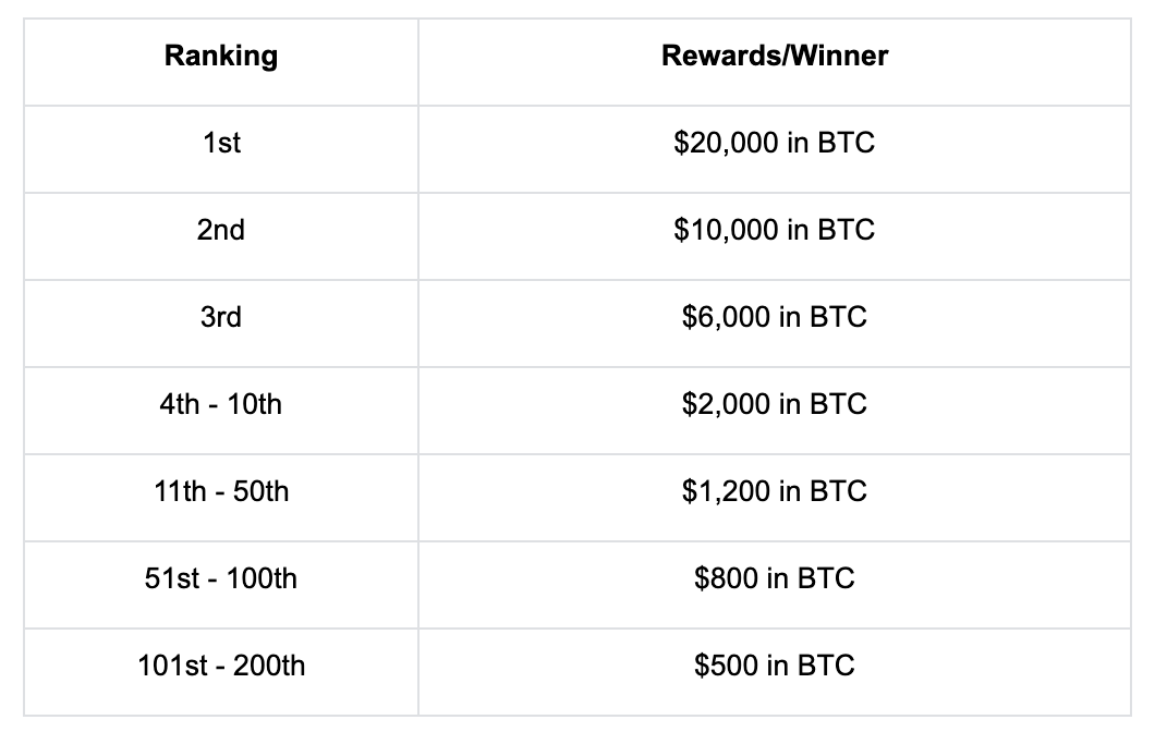 活動期間進行定投策略的用戶,累積投資額至少 500 USDT 即可參與競賽,我們將會根據參與者定投所申購額度進行排名,前 200 名參與者將依序瓜分 200,000 聰 BTC 獎金池!