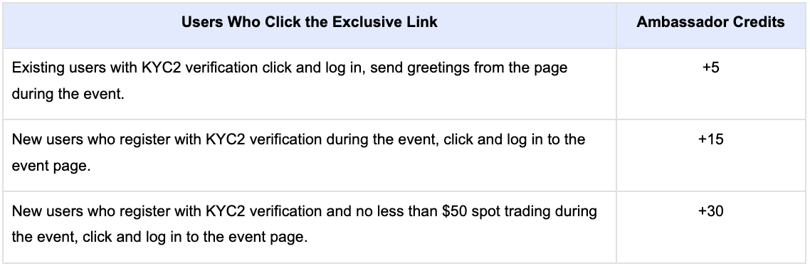 2.Only after the invited users log in to the event page by clicking the link can ambassadors get a chance to win credits. And each user can only click one exclusive link to boost the credits. The clicks from ambassador's own accounts will be deemed invalid.