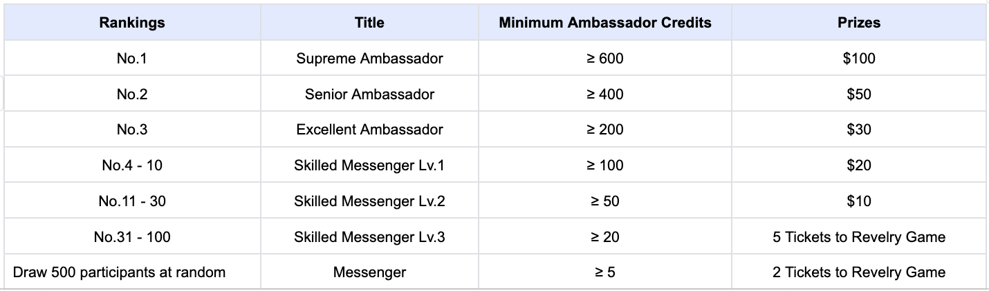Participants will be ranked based on the amount of "Ambassador Credits" to get awarded the exclusive titles. Reaching the minimum Ambassador Credits, you will stand to win the fancy gifts.