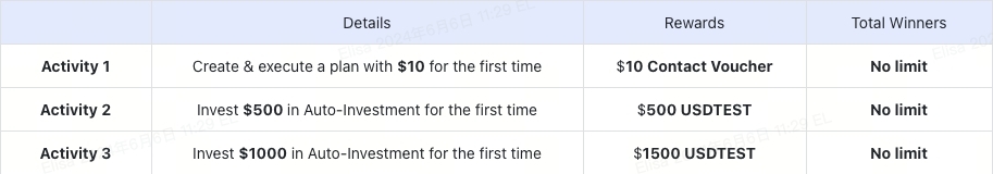 Auto-investment is a passive investment strategy where users simply follow their investment plan, making it perfect for new investors. Now, all new users have the chance to invest $10 in this product to receive an equivalent reward. If you invest more and reach the threshold as required below, you will get an additional USDTEST bonus. Click the button below to register for the event and start your Auto-Investment journey!