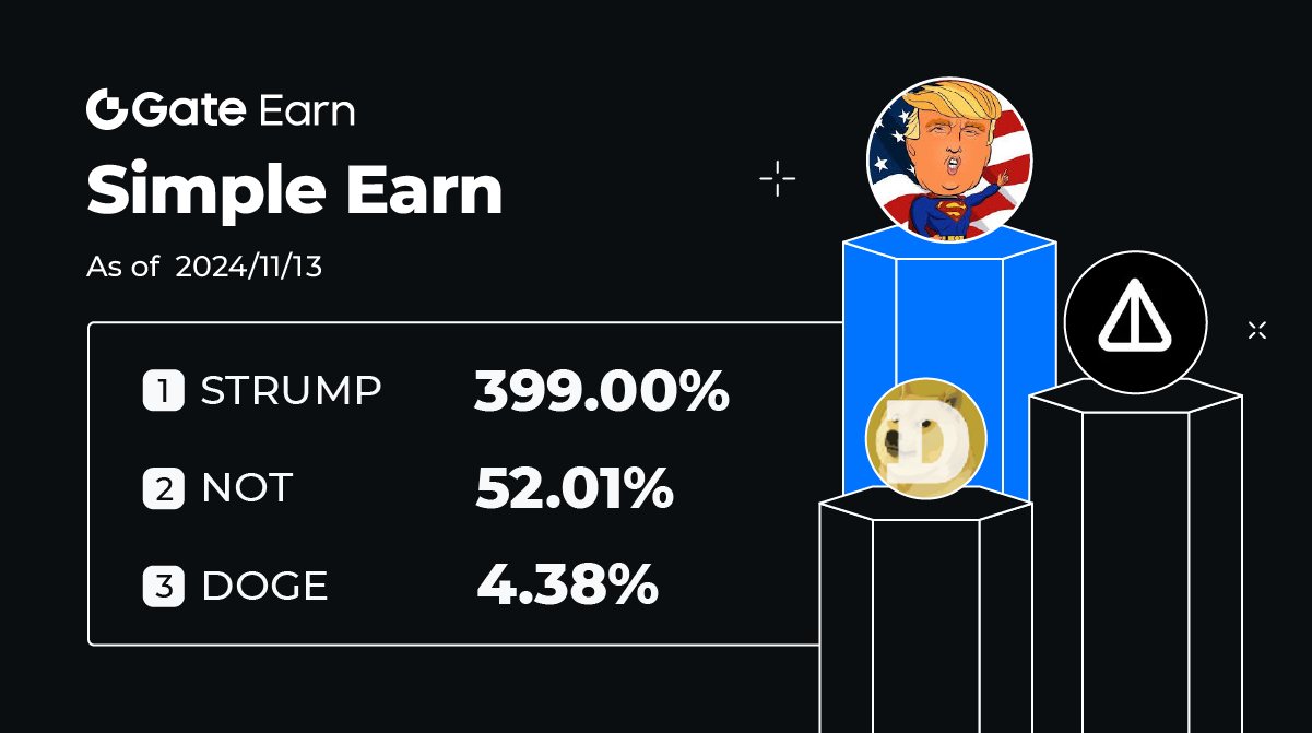 Gate supports Simple Earn STRUMP/NOT/DOGE. The high real-time APR reaches 399.00%, and their borrowed percentage hits 100%!