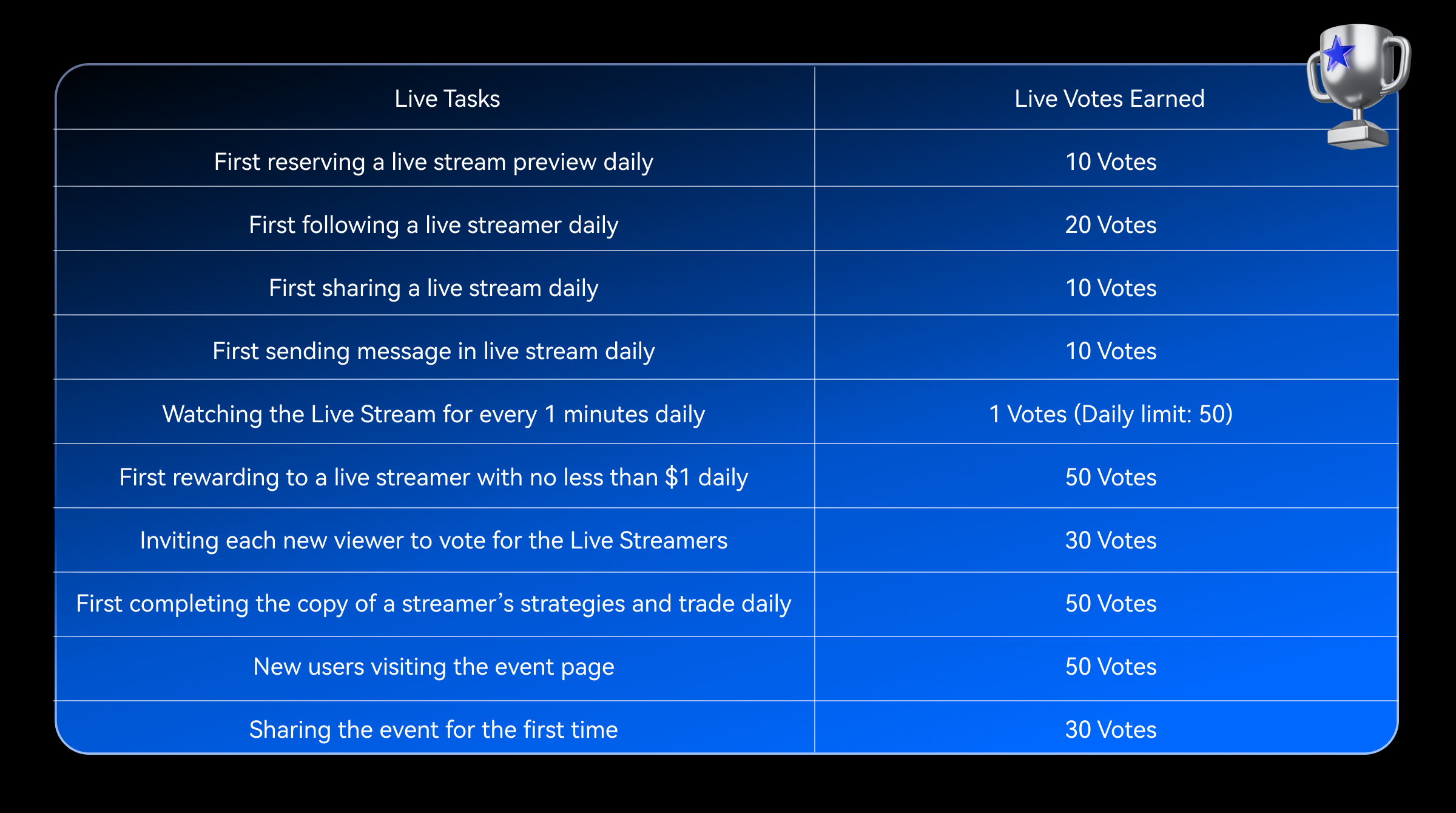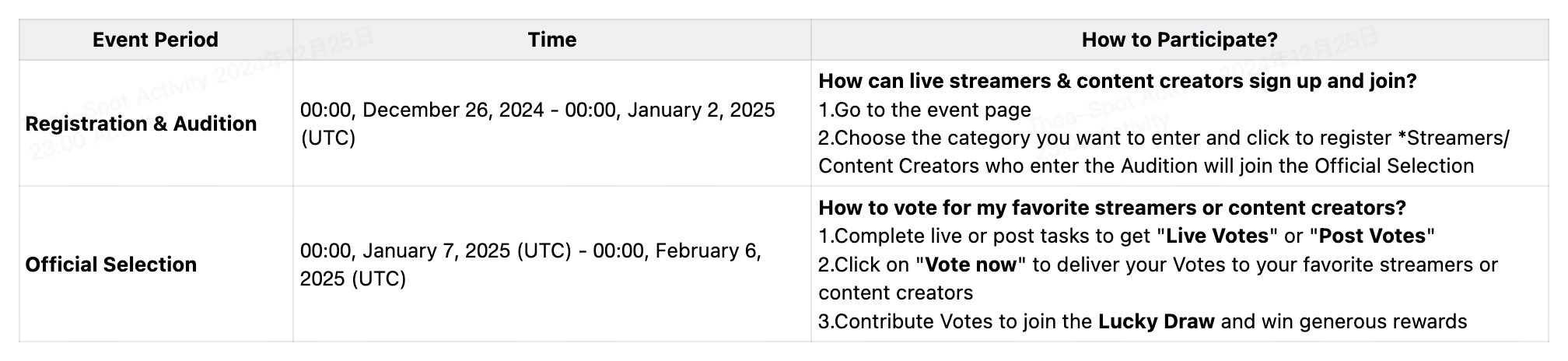 Todos los usuarios que contribuyan con Votos son elegibles para participar en el Sorteo de la Suerte. Por cada 30 Votos contribuidos, obtienes una oportunidad para participar. Los usuarios serán clasificados en función de los Votos que contribuyan a los streamers en vivo o creadores de contenido. Los 20 mejores usuarios recibirán recompensas increíbles.