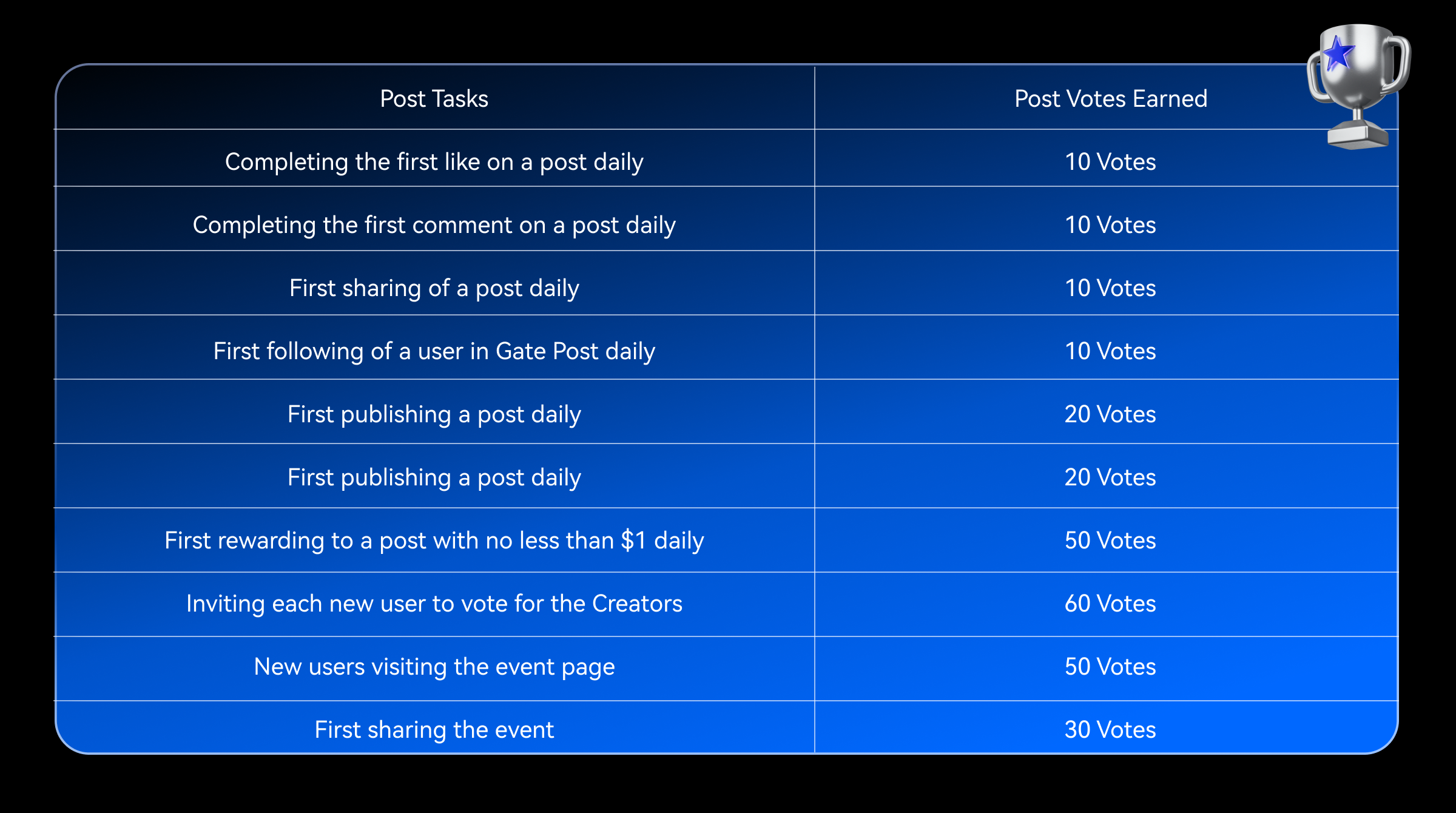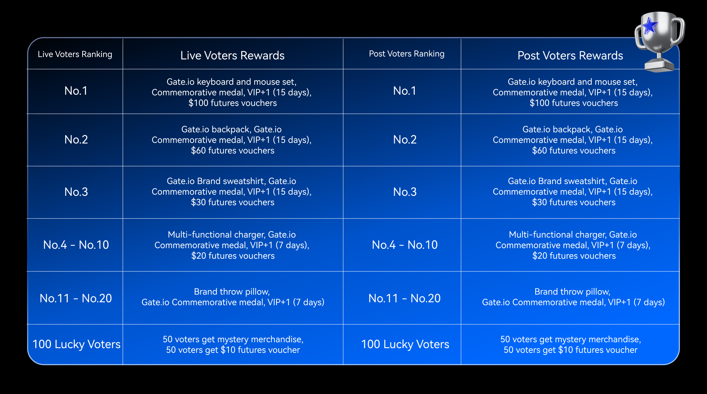 - Las recompensas Live Voters Ranking y Post Voters Ranking requieren un número mínimo de votos: al menos 1.600 votos para el 1.er lugar, 1.400 votos para el 2.º, 1.200 votos para el 3.º, 1.000 votos para el 4.º al 10.º y 800 votos para el 11.º al 20.º. Los 50 afortunados votantes necesitan al menos 20 votos. Si no se cumple el requisito mínimo de votos, las recompensas se distribuirán en función de los votos reales. Las recompensas VIP+1 tienen un límite VIP5. Si el usuario ya está en V5 o superior, la recompensa se convertirá en $10 Puntos (válido por 30 días). Se seleccionarán paquetes de productos exclusivos de Gate Medalla Conmemorativa, Sudadera de la Marca Gate y Fútbol Gate, según la emisión real. Los cupones de futuros son válidos durante 5 días. Las recompensas Live Voters Ranking y Post Voters Ranking no se pueden obtener simultáneamente. Si un usuario se ubica entre los 20 primeros de ambos rankings, recibirá la recompensa de clasificación más alta y una recompensa aleatoria adicional de $30 a $100 puntos (válida por 30 días). Cuanto más alto sea el rango, mayor será la recompensa. Si varios usuarios tienen la misma Cantidad Votada en el Ranking de Votantes, sus clasificaciones se determinarán por el orden de finalización.