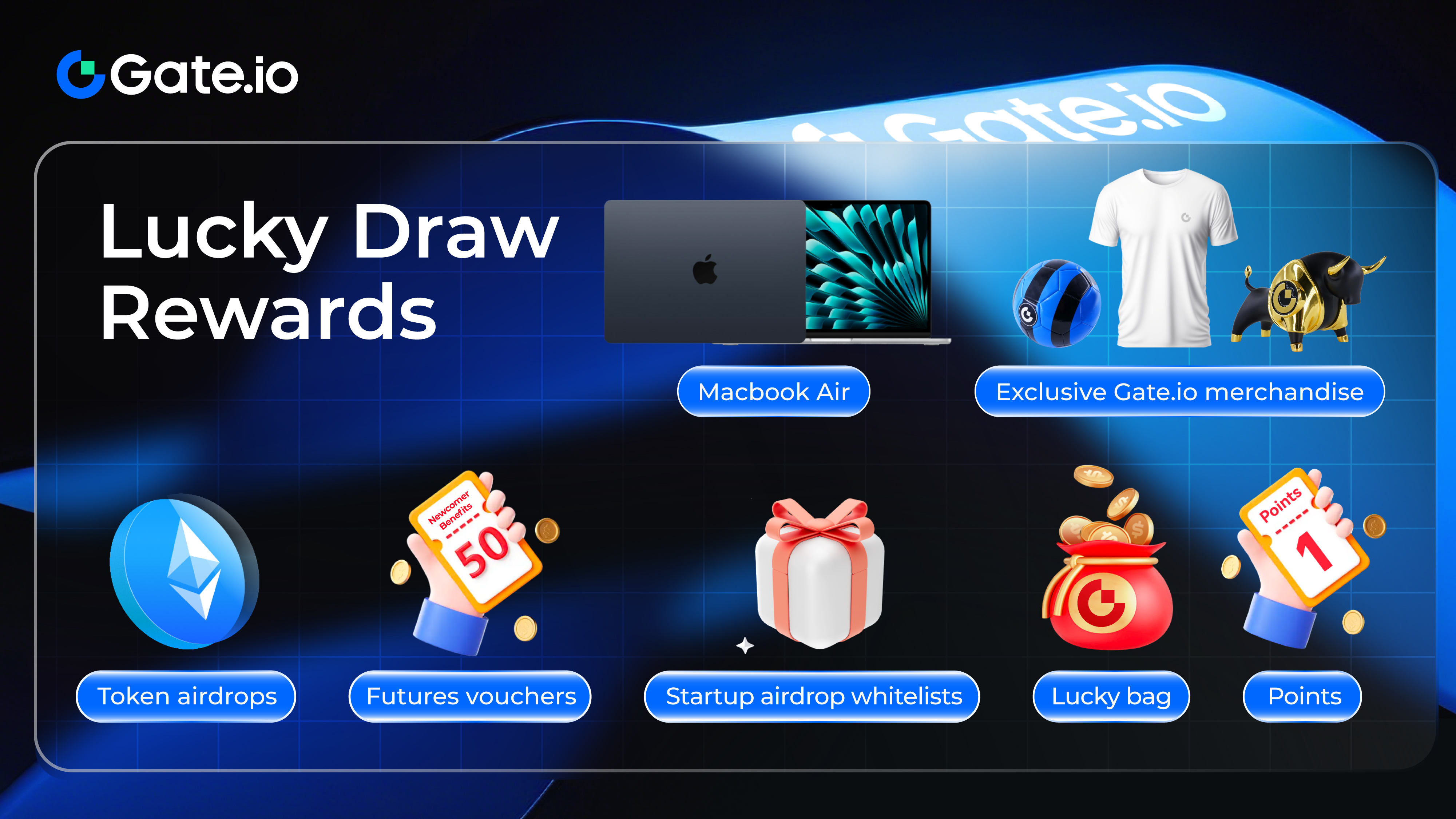 1. Premios de Sorteo de Suerte: Macbook Air, mercancía exclusiva de Gate, Airdrops, Puntos y listas blancas de airdrop de inicio.