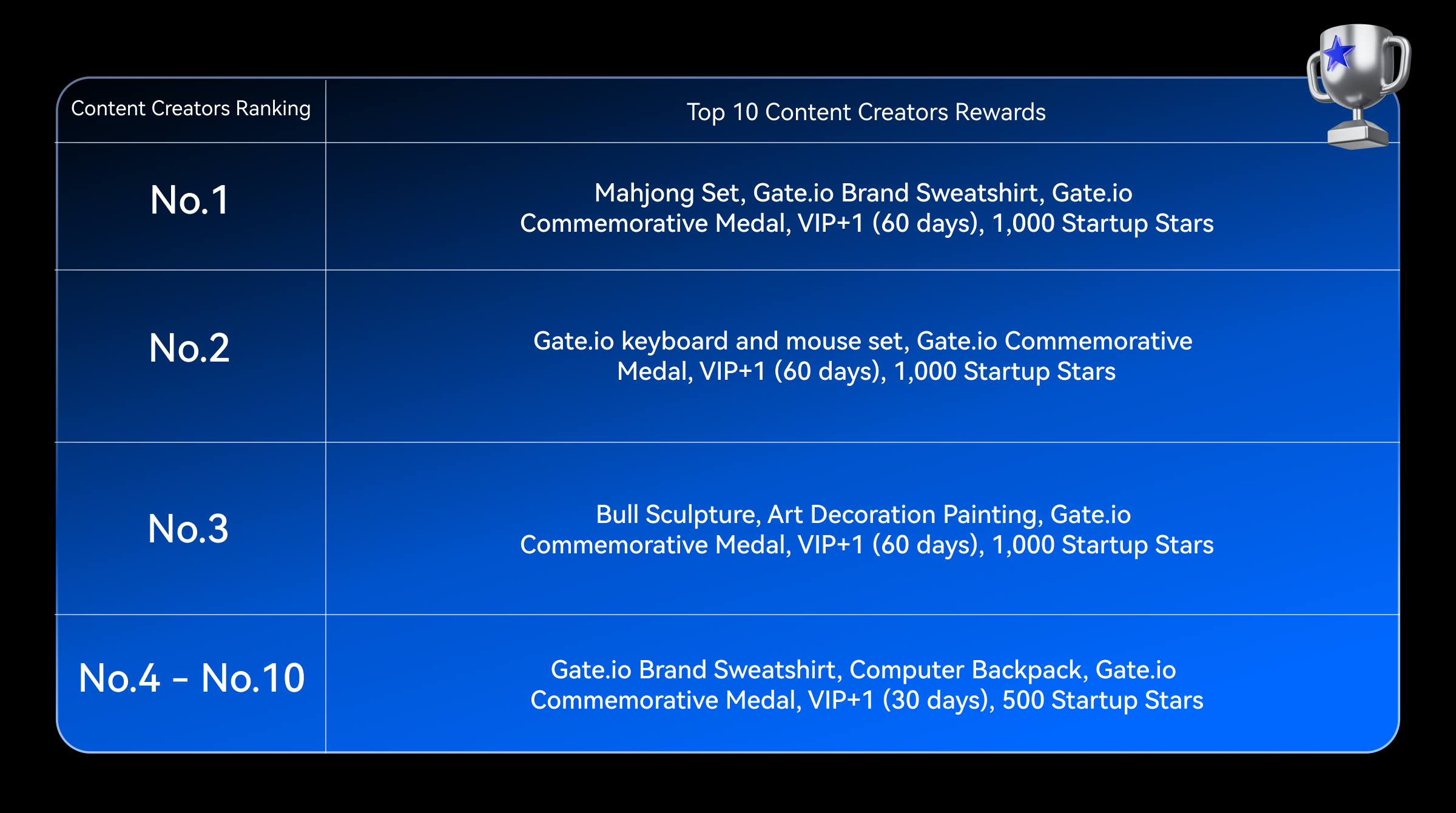 6.Beneficios exclusivos:** Reciba mercancía exclusiva de Gate, VIP +1 y la lista blanca de airdrop de Startup (acceso para reclamar millones de airdrops), los detalles son los siguientes: