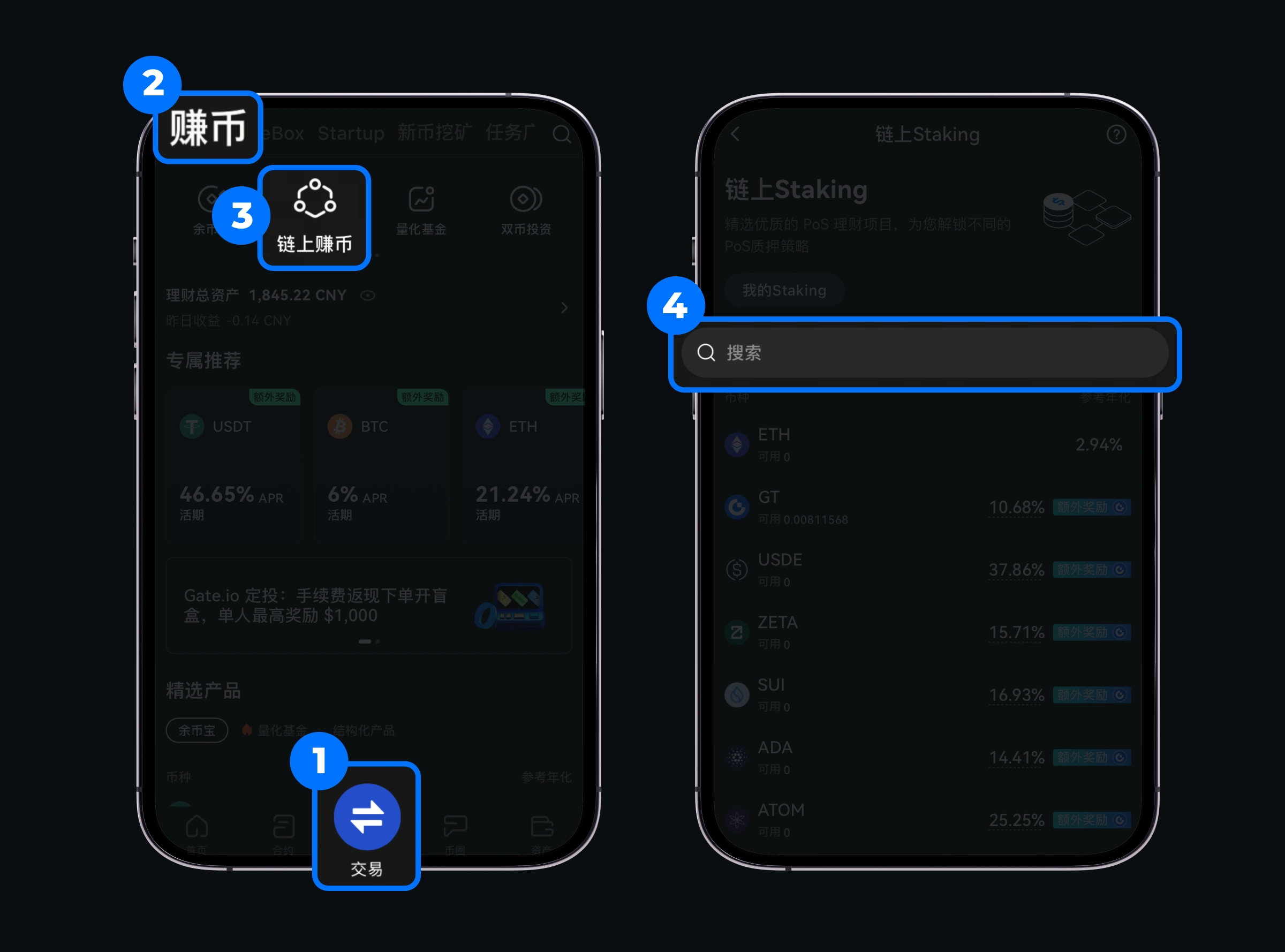App:交易 - 赚币 - 链上赚币,搜索所需币种对应产品开启申购