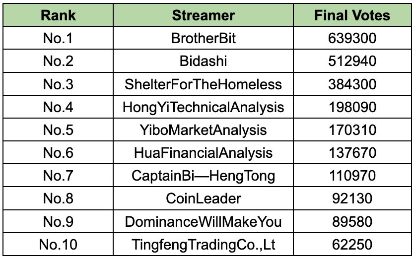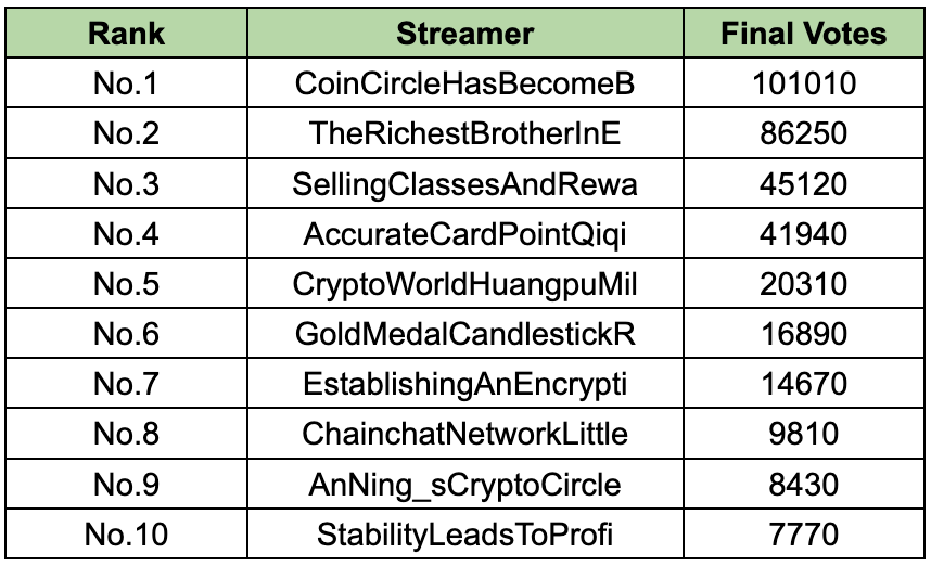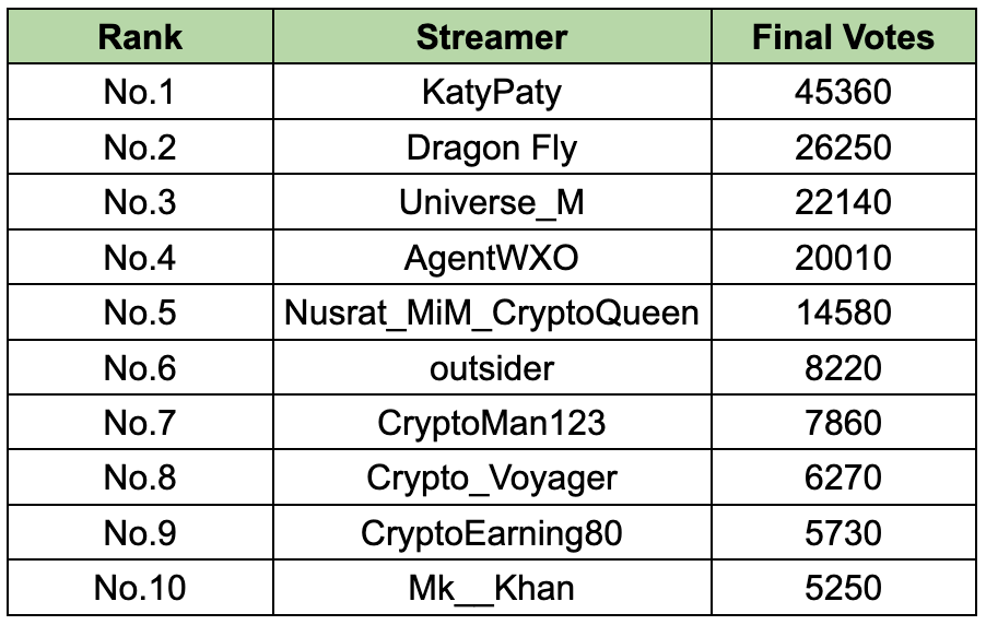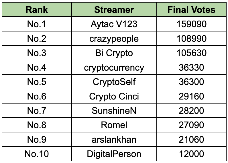 2.If streamers, content creators or voters have the same final votes, ranking will be determined by who reached the vote count first.