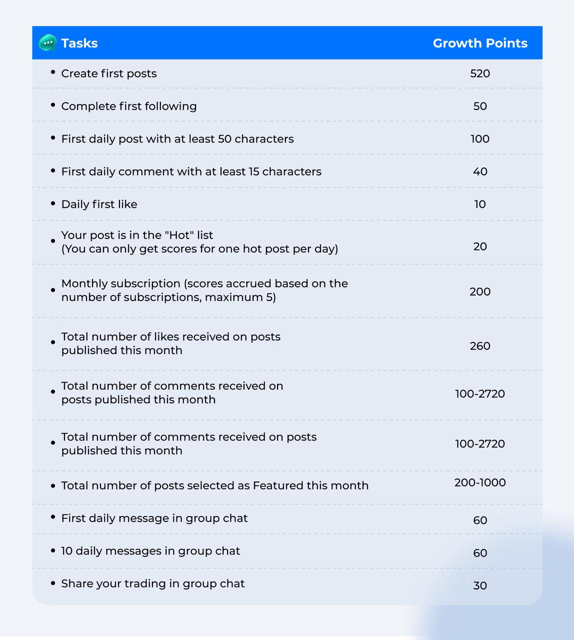 Complete tasks like posting, commenting, liking, and engaging to earn corresponding Growth Points.