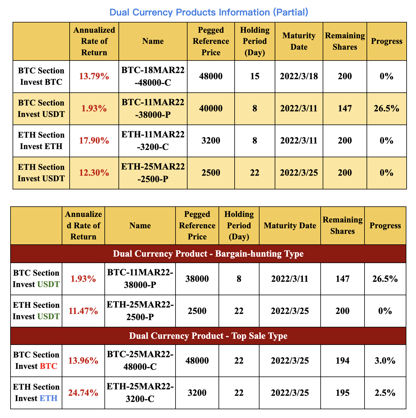 Dual Currency Products on Gate Finance now include BTC/USDT and ETH/USDT dual financial products. In the BTC section, the new products will have 8 to 22 holding days with pegged reference prices ranging from $38,000 to $50,000. BTC or USDT will be the final settlement currency at maturity for principal and earnings. As for the ETH section, new products will have 8 to 22 holding days with pegged reference prices ranging from $2,400 to $3,400. ETH or USDT will be the final settlement currency at maturity for principal and earnings.