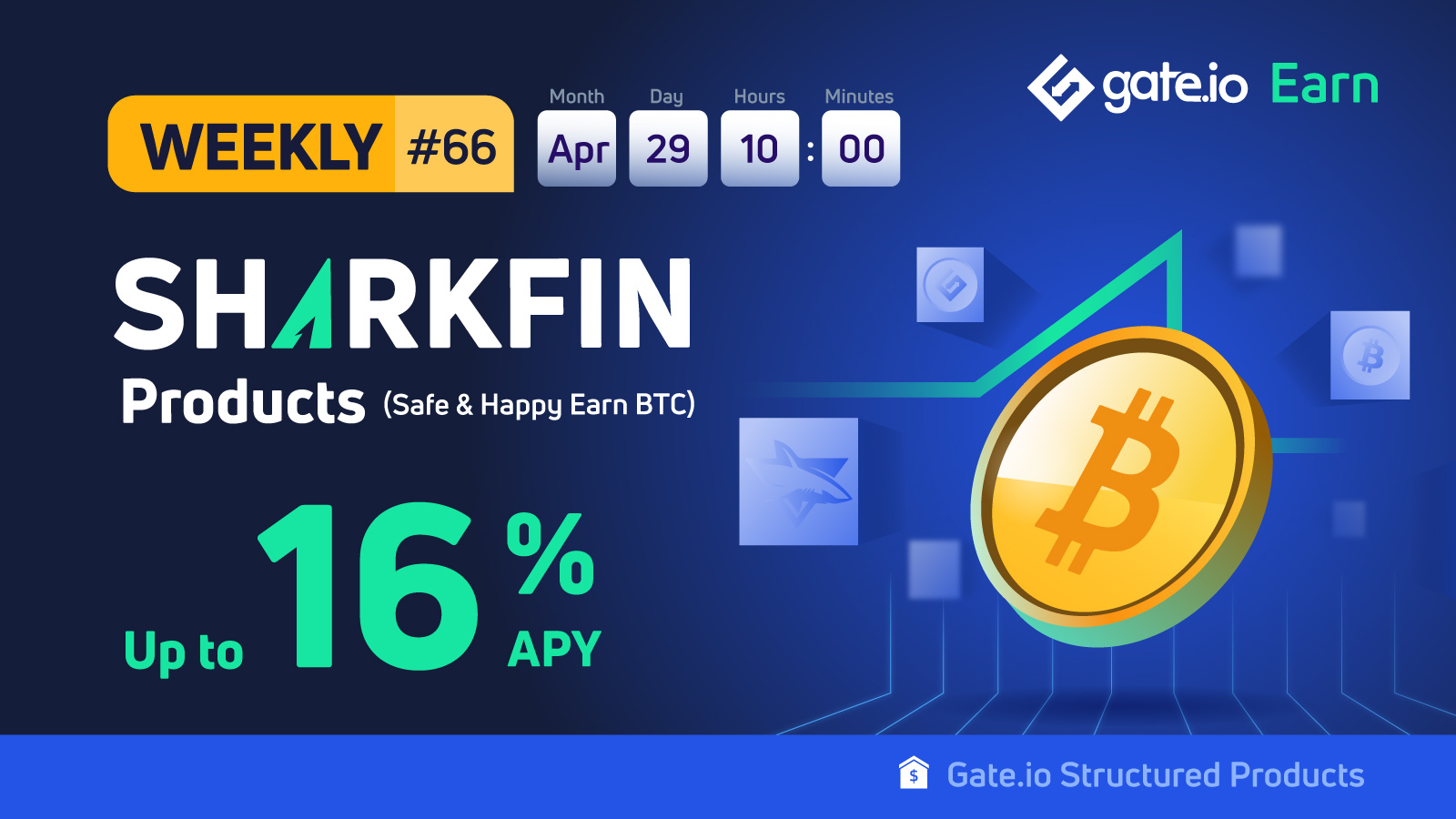 Gate Structured Products will launch its 66th weekly shark fin structured product“Weekly Shark Fin BTC 7-Day No.66” on April 29th, at 10:00 AM UTC, with an estimated return of 3%-16% P.A. The total lock-up amount is capped at 300 BTC, with a lock-up period of 7 days. The weekly shark fin product is principal protected.