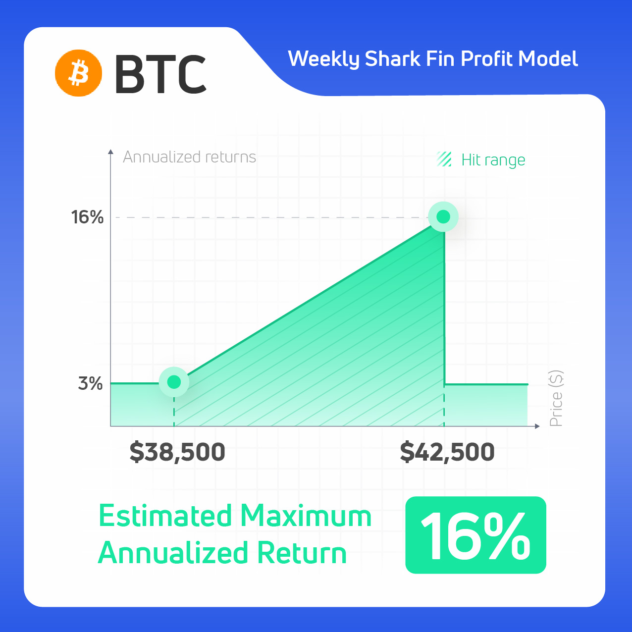 If during the entire lifetime of the shark fin product, BTC price always stays within the per-specified range ($38,500-$42,500), investors will get a return up to 16% APR. (The closer to the $42,500 level, the higher the return rate).