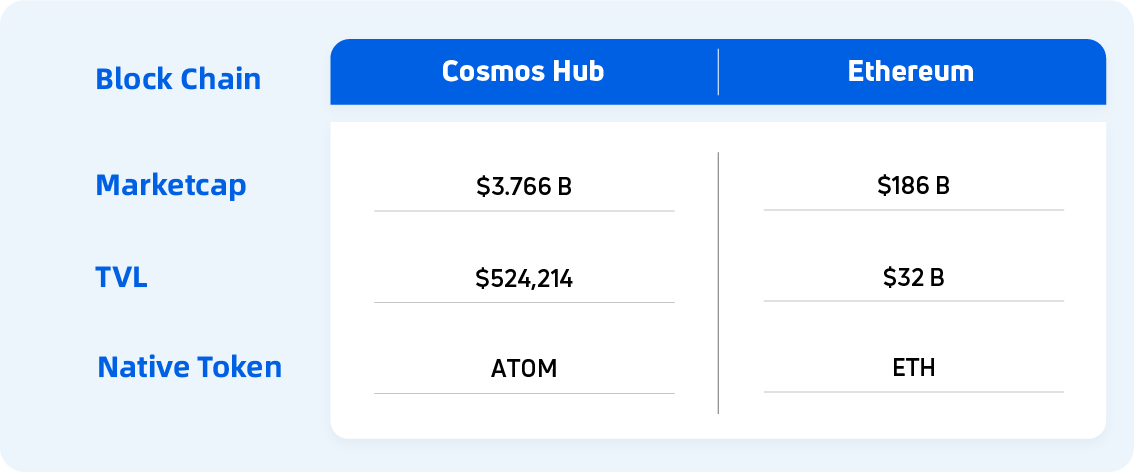 Compared to DApps on Ethereum, Cosmos has more access to application-specific chains: such as the cross-chain DeFi protocol Umee and the cross-chain liquidity Osmosis. The application-specific chain approach provides more flexibility for DApps and avoids the situation where different DApps compete for resources on one chain If we take the comparison back to the single chain level and compare Cosmos Hub with Ethereum, the following picture emerges.