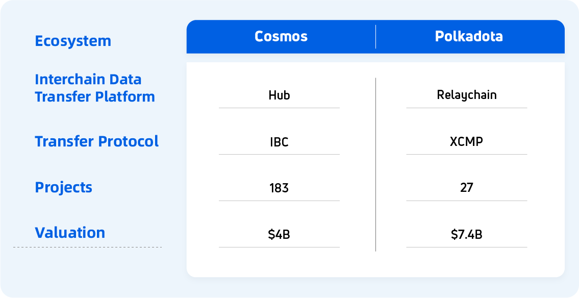 Compared to Polkadot, the hub in the Cosmos network is used as the main chain to connect different zones, but it is not the only hub in the Cosmos network. Other chains such as Osmosis and Evmos can also serve as hubs to connect zones, but in Polkadot there is only one official transmission method, the relay chain, and other chains that want to access the relay chain have to participate in the auction slots based on their native tokens DOT and can only access after winning the slot, which is also a big gap to Cosmos' almost free flexible access way.