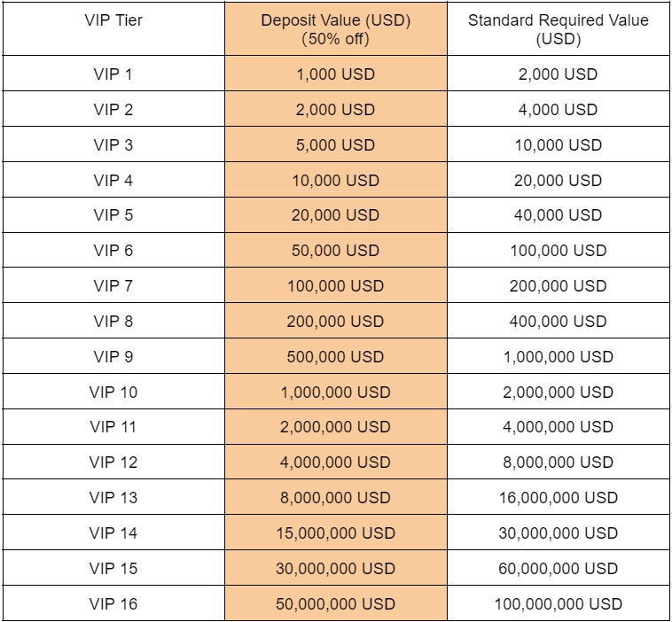 Users can deposit 50% fewer assets than that of the standard requirement, yet get the same VIP tier respectively. View the form below.