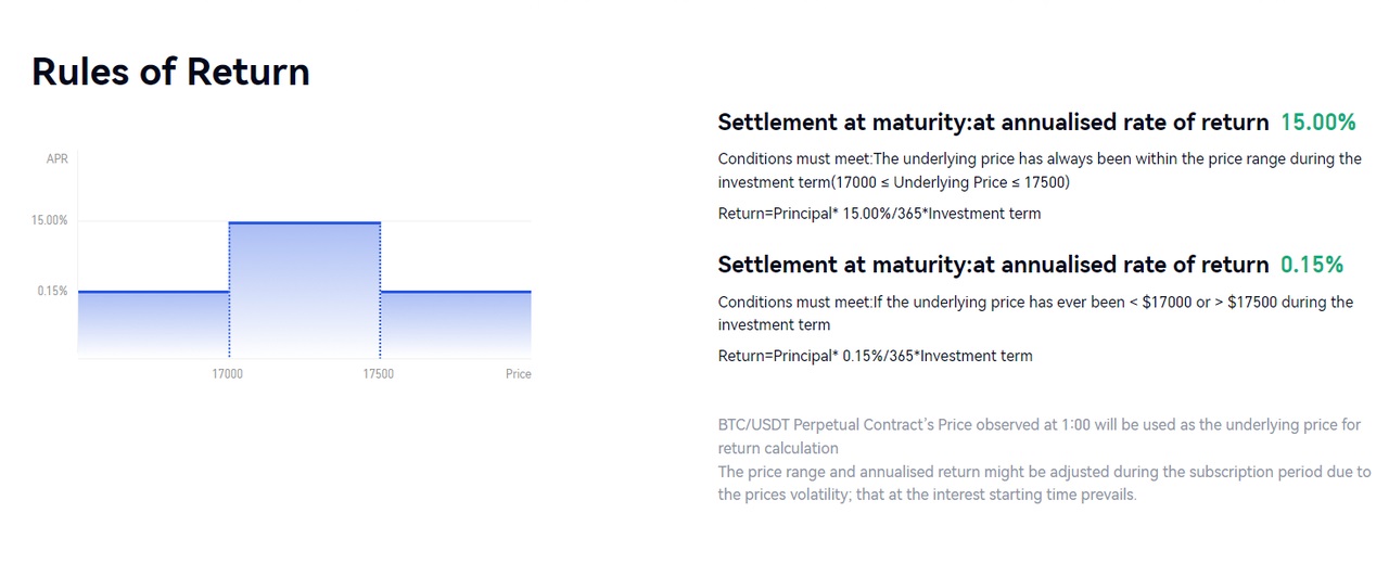 2.During the observation period, if the price of the target asset moves the upper/lower limit of the price range (that is, knock out the range), the user will obtain a guaranteed return.