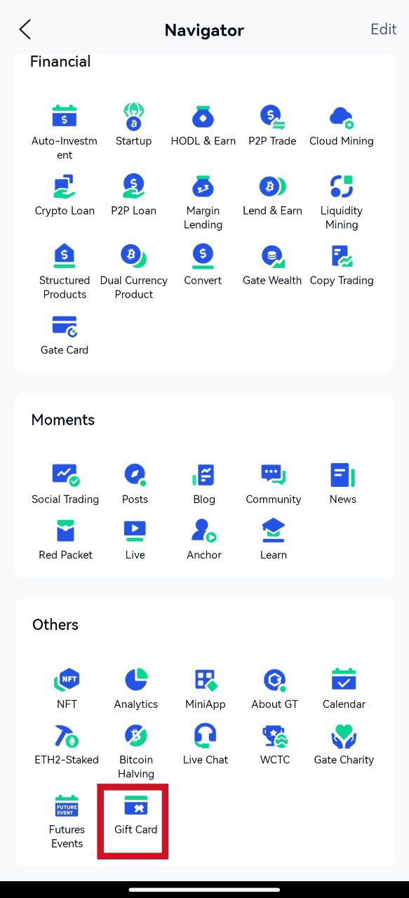 1.Log in to the Gate app, click on【More】at the homepage, then scroll down to the bottom, and click on【Gift Card】