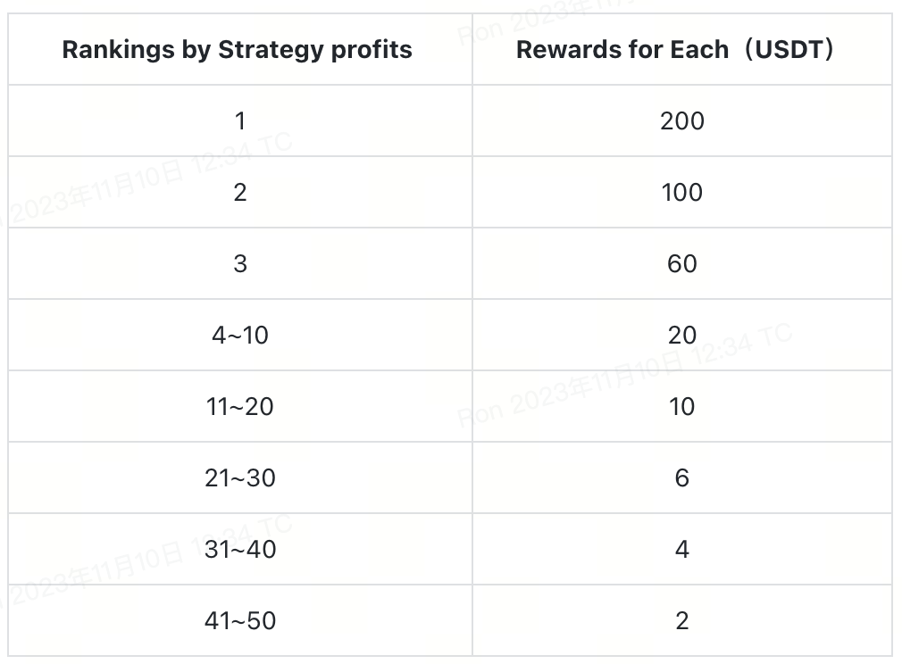 المستخدمون الذين يقومون بإنشاء أو نسخ إستراتيجية بحد أدنى لصندوق الإستراتيجية يبلغ 10 دولارات أمريكية خلال الحدث، ويحققون أعلى 50 تصنيفًا بناءً على تصنيفات الأرباح، مؤهلون للحصول على الجوائز النقدية التالية: