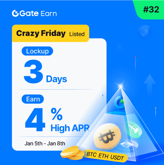 ·05 يناير - 08 يناير، Gate Crazy Friday#32: احصل على معدل فائدة سنوي مرتفع بنسبة 4% على أهم العملات المشفرة مع فترة تأمين مدتها 3 أيام
