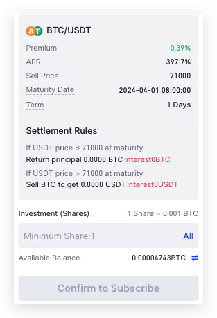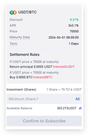 على سبيل المثال: من خلال الاشتراك في المنتج أدناه، يمكنك شراء البيتكوين بخصم 0.31% إذا استوفيت شروط الشراء عند الاستحقاق.