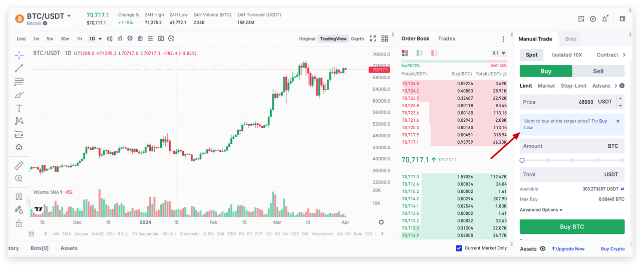 باستخدام هذه الميزة، يمكن للمستخدمين شراء العملات المشفرة المستهدفة بأسعار مخفضة. هناك ثلاثة خيارات للشراء بسعر منخفض: ذو عائد مرتفع، وخصم مرتفع، وقصير الأجل، مما يسمح للمستخدمين بالاختيار بناءً على احتياجاتهم وتفضيلات المخاطر.