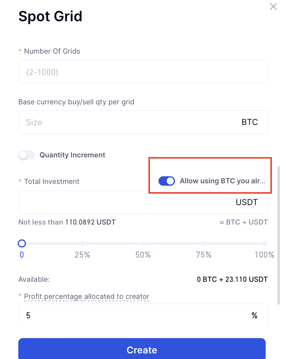 Bot Pool - إنشاء روبوت - Spot Grid - إنشاء روبوت - اختيار السوق - تعيين المعلمات - السماح باستخدام الرموز المميزة الموجودة لديك بالفعل - إنشاء