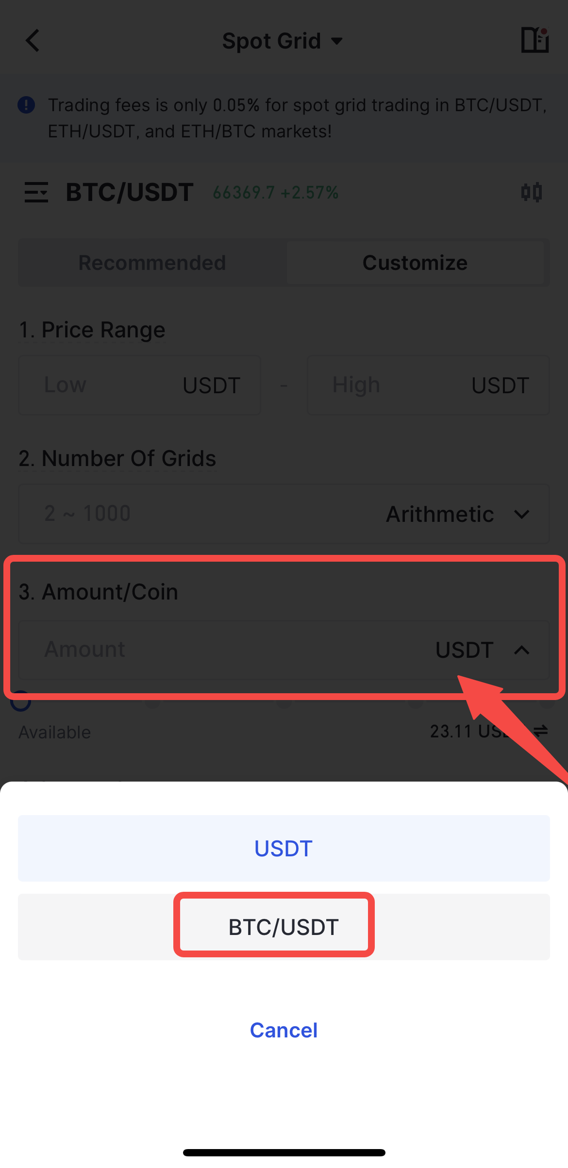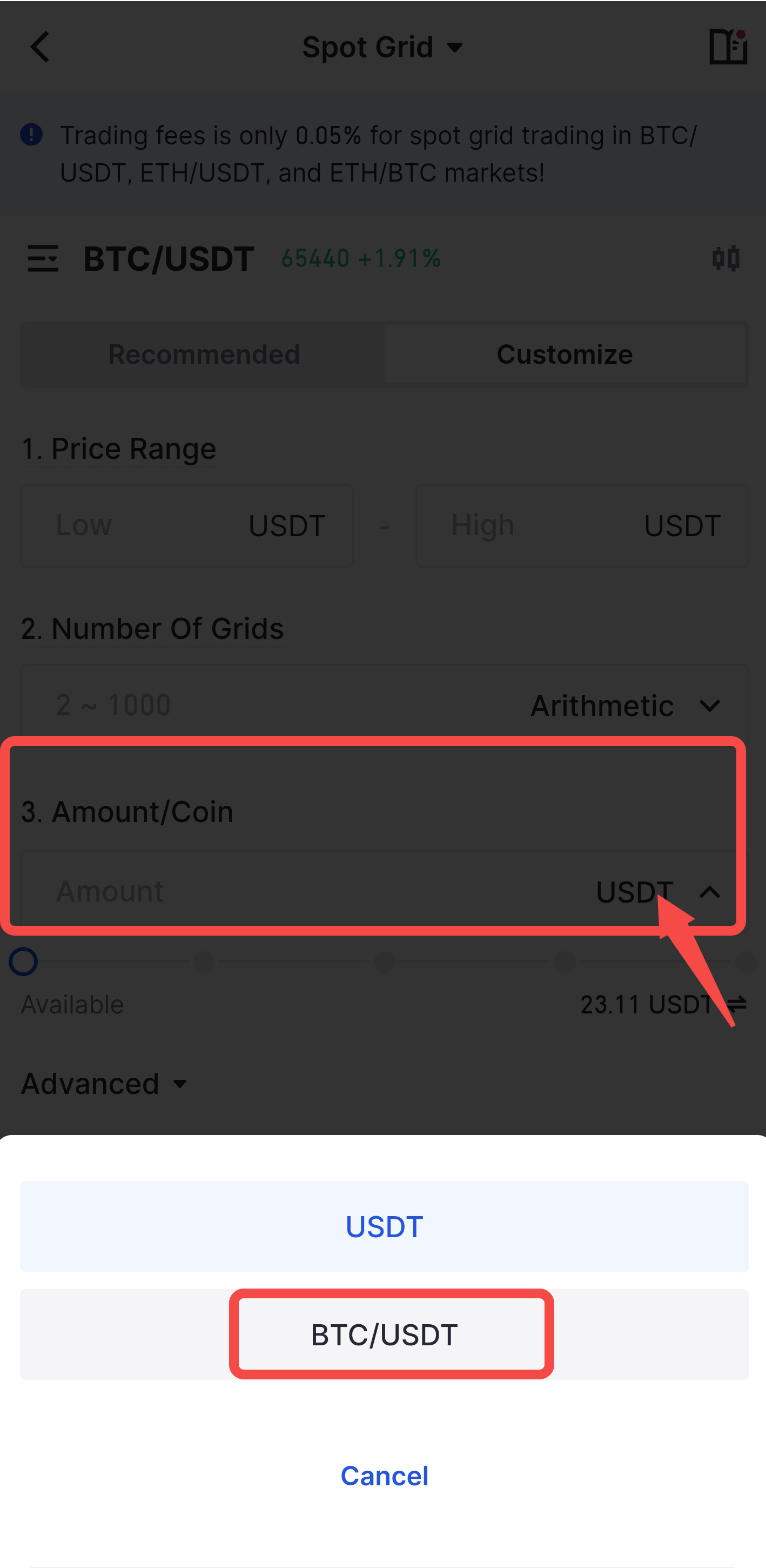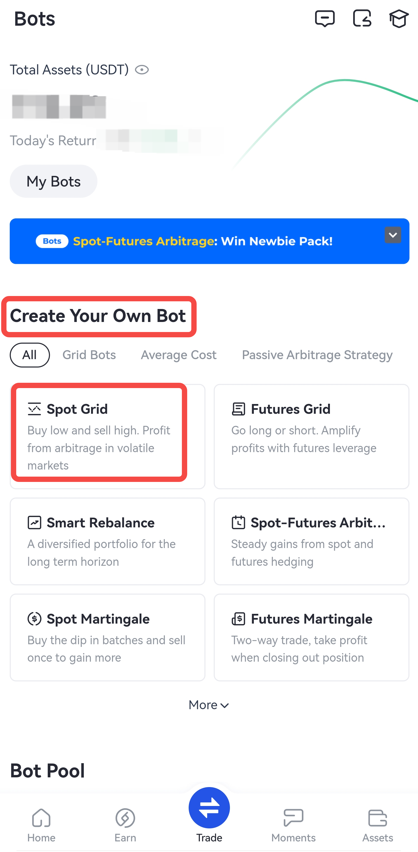التجارة - الصفحة الرئيسية للروبوتات - حدد Spot Grid أدناه قم بإنشاء الروبوت الخاص بك - اختر السوق - قم بتعيين المعلمات - حدد المبلغ/العملة - حدد الرمز المميز المستهدف/USDT - إنشاء