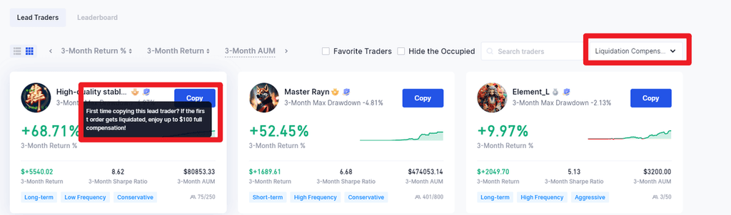 المتداولون الرئيسيون المؤهلون للحصول على تعويض التصفية، أي أنه خلال فترة الصلاحية، إذا واجه أمر النسخ الأول للناسخين الجدد التصفية، فستقوم المنصة بتعويض كامل مبلغ تداول النسخ لتلك الناسخات، بحد أقصى 50 دولارًا أمريكيًا!