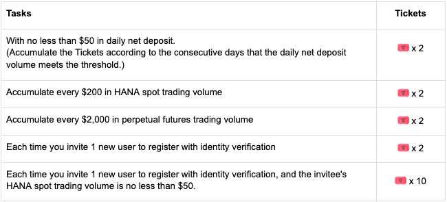 4.ستكون الجوائز في HANA، بإجمالي جائزة قدره 47،610،001 HANA. يجب على المشاركين إكمال أي تداول HANA خلال الحدث لتكون مؤهلة لتقسيم جائزة تذاكر المجموعة. سيتم توزيع الجوائز في رموز المشروع خلال 14 يوم عمل بعد انتهاء الحملة ("المحفظة" - "الفاتورة"). سيتم إصدار إعلان توزيع الجوائز. أخبار Gate.