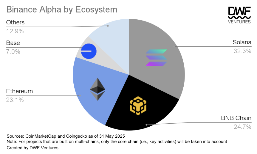 تصدرت سولانا القائمة من حيث النظم البيئية حيث حصلت على 32% من مشاريع ألفا على منصة بينانس. وتبعها سلسلة BNB وإيثريوم عن كثب، حيث حصل كل منهما على حوالي 25%. جاء تقدم سولانا من الضجة حول العملات الميمية ووكلاء الذكاء الاصطناعي في الربع الأول من عام 2025. شهدت سلسلة BNB ارتفاعًا خلال "صيف العملات الميمية"، الذي تم الترويج له من قبل CZ وقادته رموز مثل BUILDon وTest. نشأت أكثر من 50% من العملات الميمية ألفا على سولانا، بينما جاء 37% من سلسلة BNB. أظهرت هذه النظم البيئية اهتمامًا مستمرًا من المستخدمين وأحجام تداول. ساعدت المشاركة العالية مشاريع هذه البلوكشين في اكتساب الرؤية للإدراجات الفورية المحتملة.