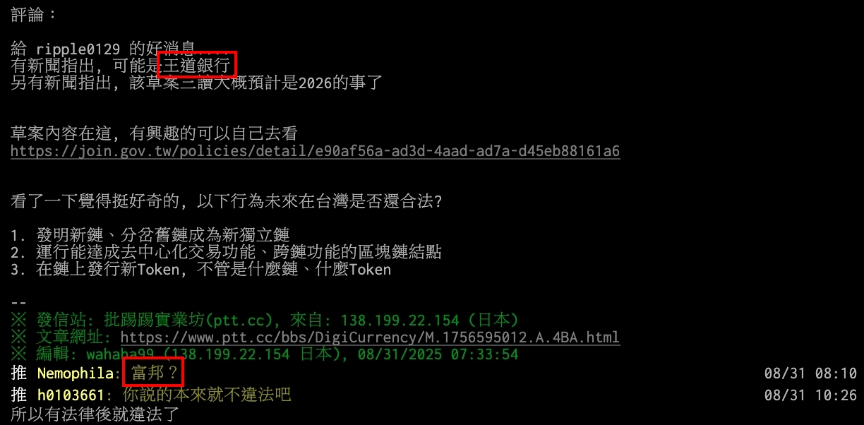 يتكهن مستخدمو PTT عن أي البنوك تجري مناقشات، وذكرت التعليقات “وانغ داو، وفوبان” من بين البنوك.