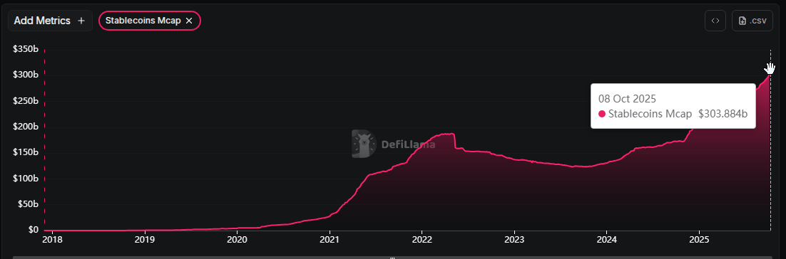 بالإضافة إلى ذلك، تشير مصدر بيانات السوق الآخر، DeFiLlama، إلى أن عرض العملات المستقرة قد تجاوز $300 مليار كدليل على أن هناك الكثير من السيولة على السلسلة وأنه يمكن أن يتدفق إلى الأصول عالية المخاطر مثل بيتكوين.