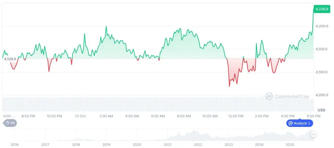 إيثيريوم(ETH)، الرسم البياني اليومي، لقطة شاشة على CoinMarketCap في الساعة 13:24 بتوقيت UTC في 14 أكتوبر 2025. المصدر: CoinMarketCapيؤكد بحث Coincu على التحولات المحتملة بسبب الديناميات الاقتصادية العالمية، مع التركيز بشكل خاص على المواقف التنظيمية والتقدم التكنولوجي الذي يؤثر على العملات المشفرة والأصول التقليدية.