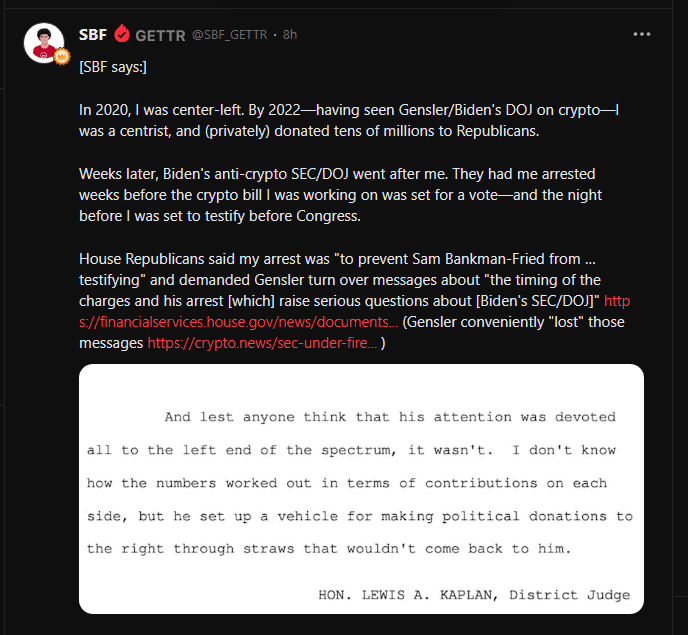 قام سام بانكمان-فريد بالهجوم، متهمًا إدارة الرئيس الأمريكي السابق جو بايدن باستهدافه بعد أن قال إنه حول تبرعات كبيرة نحو القضايا الجمهورية.