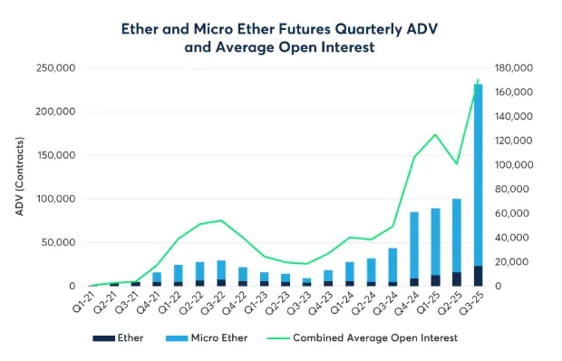 أعلنت مجموعة CME في تقريرها عن الأرباح للربع الثالث من عام 2025 أن تداول العقود الآجلة وخيارات العملات المشفرة قد وصل إلى مستوى قياسي جديد، حيث تجاوز إجمالي حجم التداول 900 مليار دولار. وبلغ متوسط العقود المفتوحة اليومية (ADOI) 31.3 مليار دولار، في حين تم تسجيل أعلى مستوى اسمي في 18 سبتمبر بلغ 39 مليار دولار.