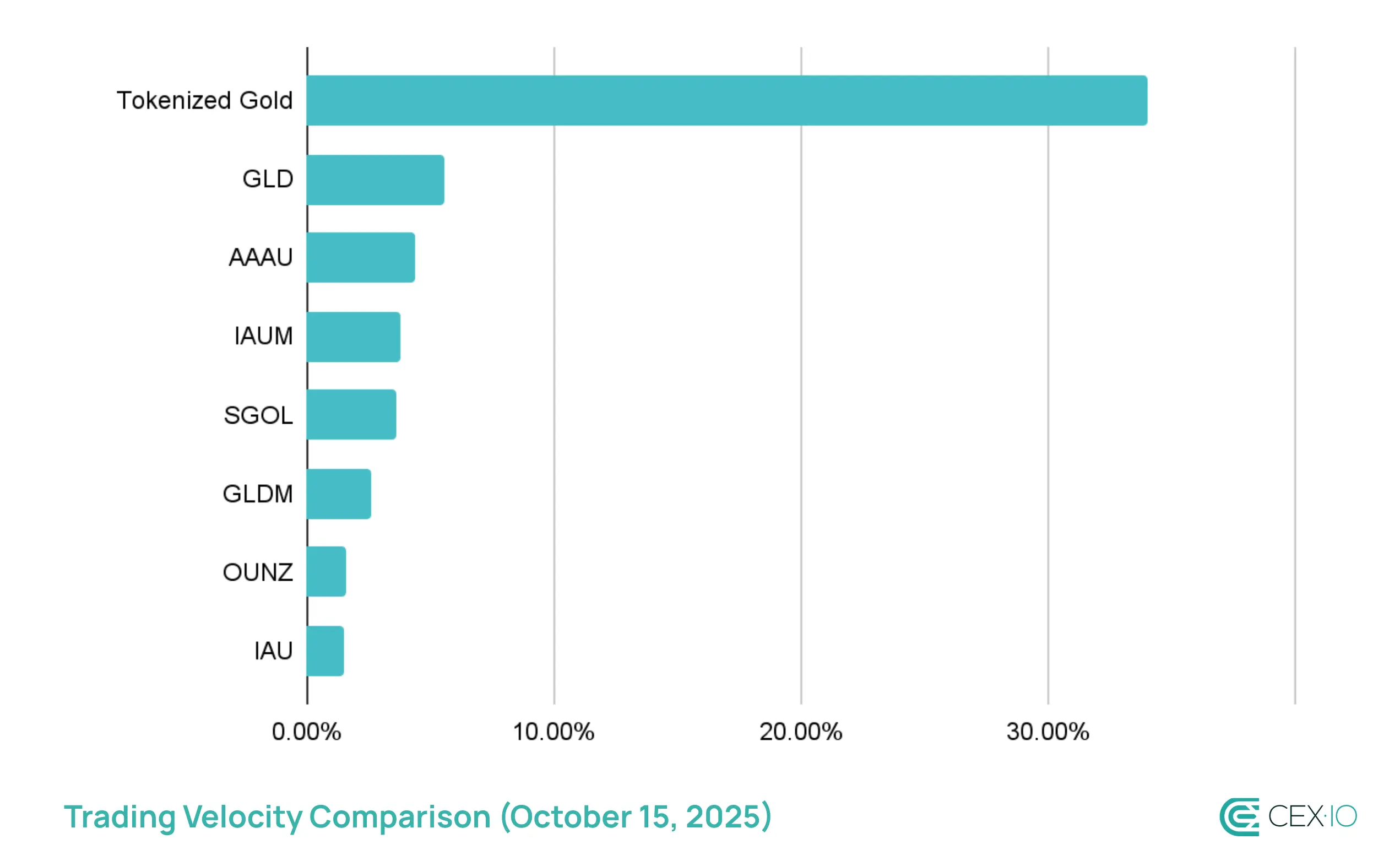 من الجدير بالذكر أن كل هذه الأنشطة التجارية تحدث من قاعدة سوقية صغيرة نسبيًا. بينما تملك GLD و IAU رؤوس أموال سوقية تبلغ تقريبًا $125 مليار و $60 مليار على التوالي، فإن رأس المال السوقي للذهب الرقمي يتجاوز قليلاً $3 مليار. على الرغم من حجمه الأصغر، يتداول الذهب الرقمي بسرعة أعلى بكثير من صناديق الاستثمار المتداولة الكبرى وحتى العملات البديلة. تُظهر النسب الحالية لحجم التداول إلى رأس المال السوقي أن الذهب الرقمي يبلغ 34%، مقارنةً بـ GLD بنسبة 5.6% و IAU بنسبة 1.5%، مما يبرز مدى نشاط شراء وبيع العملات الرقمية المدعومة بالذهب بالنسبة لحجمها.