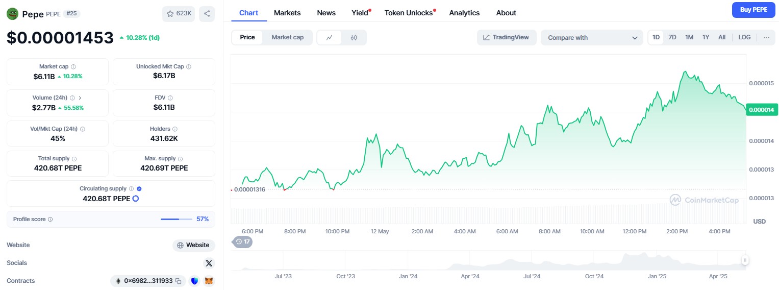 في وقت كتابة هذه السطور يوم الاثنين، يتم تداول PEPE بسعر 0.00001453 دولار، بزيادة قدرها 10% خلال اليوم.