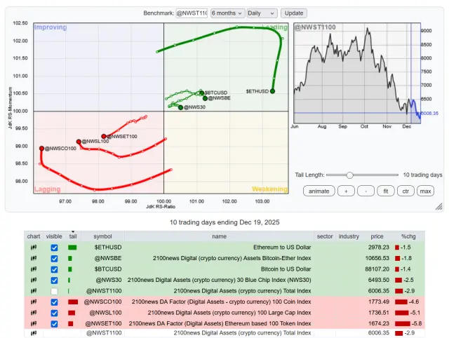 *تُظهر مخططات RRG® القوة النسبية والزخم لمجموعات الأصول الرقمية. تظهر تلك ذات القوة النسبية والزخم القوي في الربع الأخضر الرائد. مع تلاشي الزخم النسبي، عادةً ما تنتقل إلى الربع الأصفر الضعيف. إذا تلاشى الزخم النسبي، تنتقل إلى الربع الأحمر المتأخر. وأخيرًا، عندما يعود الزخم للانتعاش، تنتقل إلى الربع الأزرق المُحسن.)