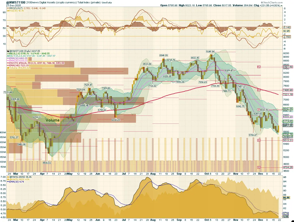 4. قد يستقر مؤشرات الاتساع في أسفل المخطط الأول (NWST1100): خط حجم التقدم والانخفاض (ADVL)، الذي عدلته 2100News للسوق الرقمية باسم ADVPL، يتتبع حجم الأموال الصافية للأصول الرقمية المتقدمة مقابل المتراجعة. قد يستقر مؤقتًا مع تباطؤ حدة البيع. قد يختفي مؤشر التجميع McClellan، وهو نسخة طويلة الأمد من مذبذب McClellan الذي يقيس اتساع السوق، أيضًا، مما يشير إلى استقرار مبدئي في المشاركة.