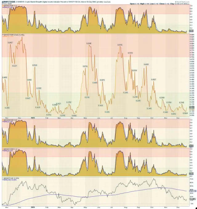 وفقًا للمخطط على اليمين، عبر جميع القطاعات الرئيسية (NWST1100، NWSET100، NWSL100، NWSCo100)، ارتفعت قراءات A50R — حصة الأصول التي تتداول فوق متوسطاتها المتحركة لمدة 50 يومًا — إلى مستويات تتراوح بين 7% و14%. تظل رموز Ethereum (NWSET100) الأضعف، مع وجود 7% فقط من مكوناتها فوق متوسطاتها لمدة 50 يومًا. بشكل عام، تشير بنية الاتساع إلى غياب المشاركة الواسعة وراء الانتعاش.