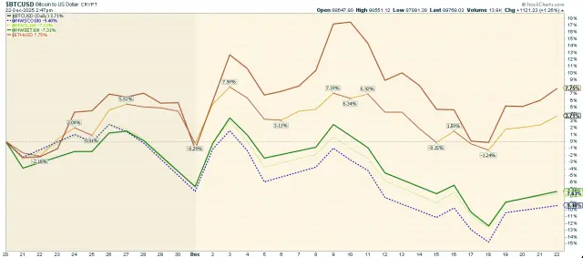 على الرغم من الانتعاش القوي في 19 ديسمبر، لا يزال سوق العملات الرقمية في مرحلة تصحيحية. سيطر على الأسبوع تقلبات، واختراقات فاشلة، وضغوط بيع متجددة قبل أن يغير الاختراق الفني في نهاية الأسبوع المزاج بشكل طفيف للأعلى. الزخم مستقر لكنه لا يزال ضعيفًا، والاتساع لا يزال في حالة بيع مفرط عميق. القيادة ضيقة، مع أداء إيثير أفضل من بيتكوين والمؤشرات الأوسع. انتقل السوق من حالة الاستسلام إلى مرحلة استقرار مؤقت، وليس بعد انعكاس اتجاه مؤكد.