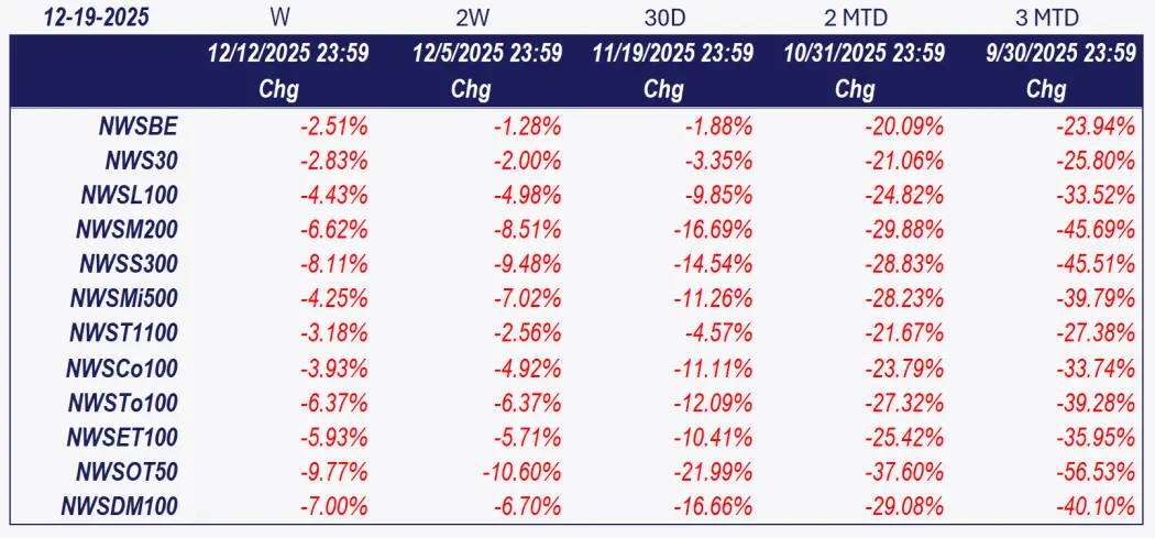 انخفض مؤشر NWST1100 بنسبة 3.18%، مع ارتفاع التقلبات وسيناريوهات مشاعر السوق المتشائمة بشكل رئيسي. بدأ الأسبوع بميل طفيف نحو الإيجابية، لكنه سرعان ما انزلق إلى مرحلة من الانخفاضات المتسارعة بعد عدة اختراقات فاشلة من الأعلى. زادت ضغوط البيع في منتصف الأسبوع، مما يعكس ثقة هشة وأنماط رفض متكررة عبر المؤشرات الرئيسية. بعد انتعاش قصير مرتبط بـ FOMC في 15 ديسمبر ومحاولة تعافي على شكل حرف V في 16 ديسمبر، فشل السوق في الحفاظ على زخم الارتفاع. أدت الرفضيات المتجددة في 17 و18 ديسمبر إلى دفع الأسعار أدنى مرة أخرى. حدث تحول حاسم في 19 ديسمبر، عندما نفذ السوق اختراقًا مقنعًا من مثلث هابط، مما أدى إلى انعكاس أعلى.
